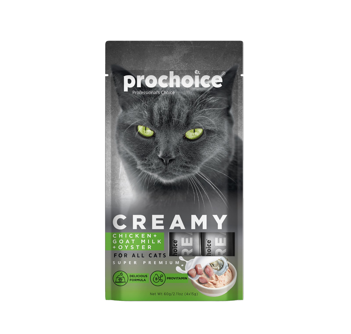 Prochoice Creamy Tavuklu ve İstiridyeli Sıvı Kedi Ödül Maması, kedileriniz için özel olarak formüle edilmiş lezzetli ve besleyici bir mamadır. Tavuk, keçi sütü ve istiridye içeren bu ödül maması, kedinizin sağlıklı deri ve parlak tüy oluşumunu destekler.
