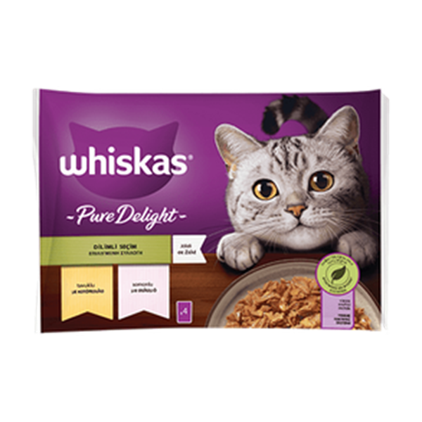 Whiskas Pure Delight 13’lü koli ekonomik paket! Tavuklu ve somonlu yaş mama ile kedinize dengeli ve lezzetli beslenme sunun.