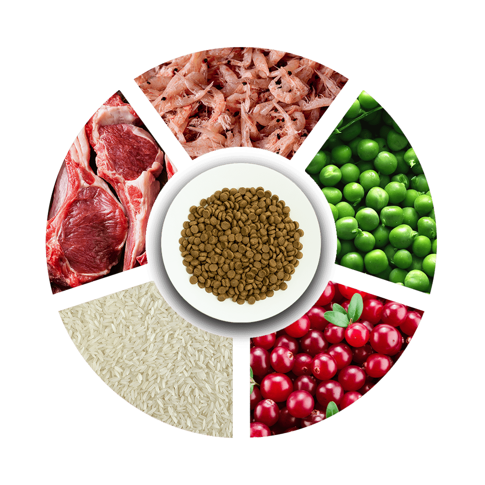 Kurutulmuş Tavuk Proteini (%34), Mısır, Bütün Bezelye, Tavuk Yağı, Hidrolize Tavuk Proteini, Beyaz Pirinç (%4), Kurutulmuş Kuzu Proteini (%4), Kurutulmuş Pancar Küspesi, Mısır Glüteni, Maya Özütü (%0,5), Kurutulmuş Somon (%0,5), Somon Yağı (%0,5), Kuru Bira Mayası (%0,5), Mineraller, Susuz Karides, Kurutulmuş Kızılcık, Yucca Schidigera.