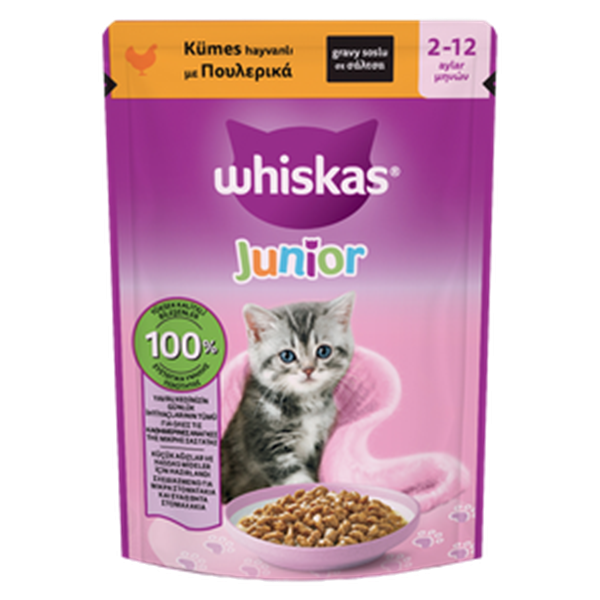Whiskas Junior kümes hayvanlı yaş kedi maması, 2-12 ay arası yavru kedilerin gelişim ihtiyaçlarına özel olarak formüle edilmiştir. Yumuşak yapısı sayesinde küçük ağızlar için kolay tüketim sağlar.