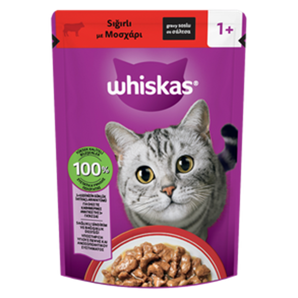 Whiskas sığır etli yaş kedi maması, yetişkin kedilerin günlük beslenme ihtiyaçlarını karşılamak üzere özel olarak geliştirilmiştir. Lezzetli sos içerisindeki et parçaları sayesinde iştahı artırır.